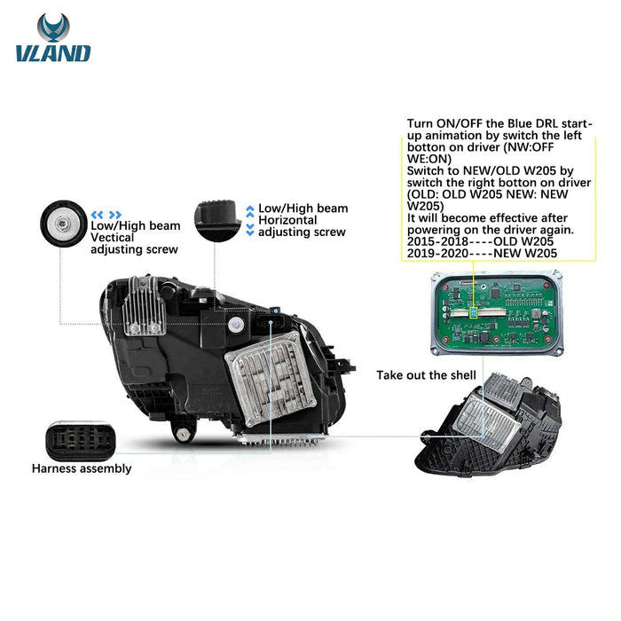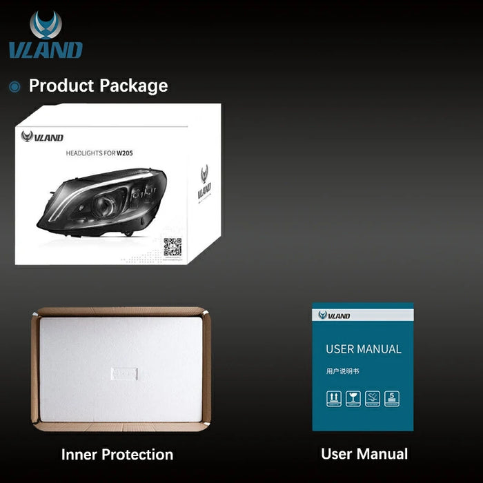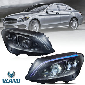 Phares LED VLAND avec bleu pour Mercedes Benz Classe C W205 2015-2020 (un seul côté ou ensemble complet)